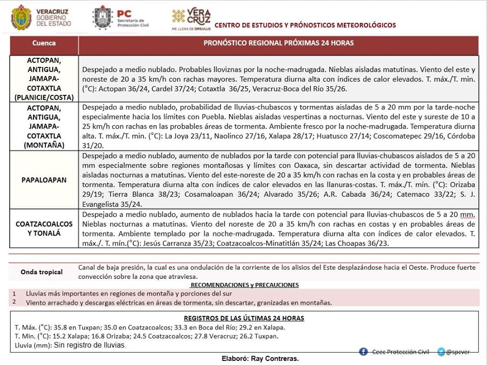 *Región Sur*: (Cuencas del Papaloapan, Coatzacoalcos y Tonalá, incluyendo Los Tuxtlas): Parcialmente nublado por la mañana, aumentando los nublados y la probabilidad de lluvias y tormentas (actividad eléctrica y ráfagas de viento) aisladas por la tarde-noche y madrugada. Acumulados estimados de 5 a 15 mm con máximos de 30 a 50 mm, estas últimas especialmente en regiones montañosas. Visibilidad reducida por calina durante el día. Nieblas nocturnas a matutinas. Viento dominante del Norte y Noreste de 20 a 35 km/h en la costa, rachas mayores en zonas de tormeta. Ambiente caluroso al mediodía-tarde. Tmáx./Tmín. 33-37/22-25°C (Menores en la región de los Tuxtlas).