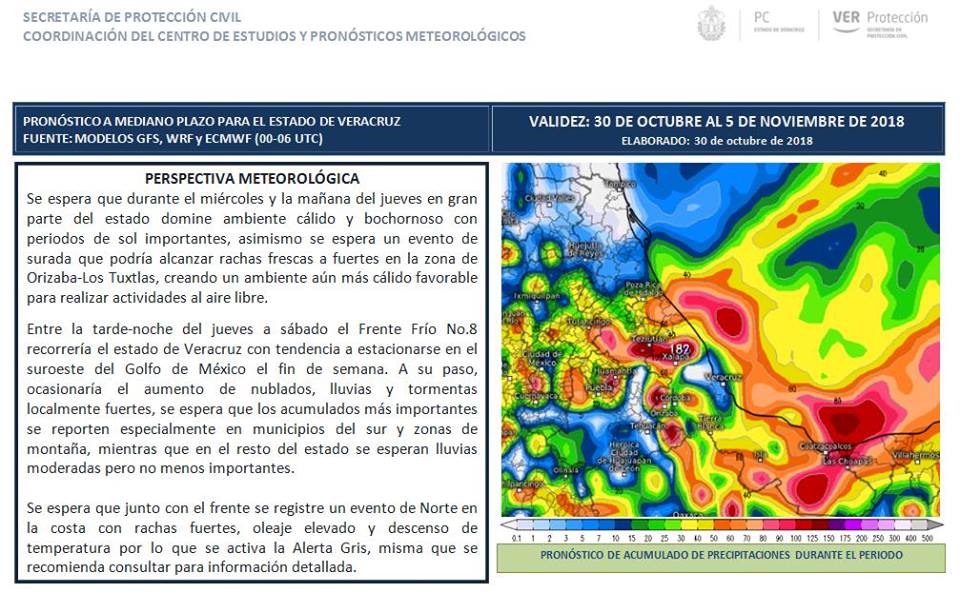 Los modelos meteorológicos sugieren para los siguientes siete días en el estado de Veracruz una temperatura media dentro o por abajo de lo normal y lluvia acumulada por arriba del promedio. Los modelos climáticos indican un NOVIEMBRE con temperatura media ligeramente por arriba de sus valores normales y lluvia por arriba de la climatología en el norte y dentro en el centro-sur.
