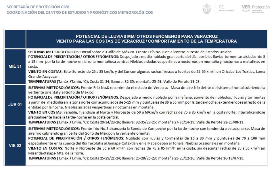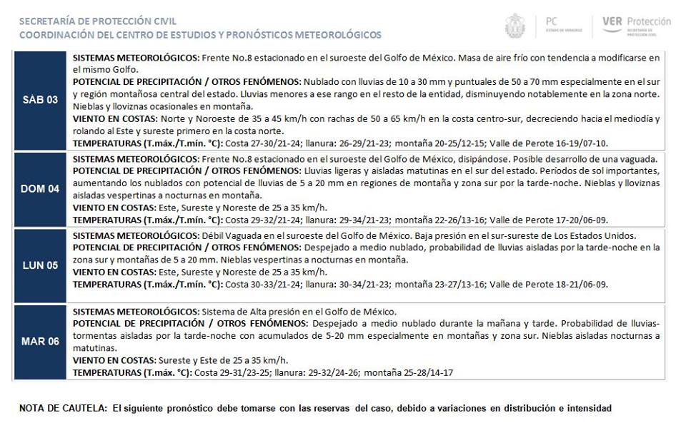 *Región Sur* (Cuencas del Papaloapan, Coatzacoalcos y Tonalá, incluyendo Los Tuxtlas): Despejado a medio nublado, probabilidad baja de lluvias. Viento variable, fijándose al sur-sureste de 20 a 35 km/h por la tarde-noche incrementándose mañana con rachas de 40 a 55 km/h. Ambiente caluroso. TMáx/TMín 31-34/22-24°C (Menores en la región de los Tuxtlas).