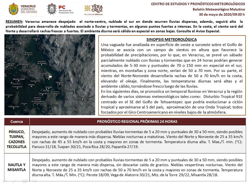 *Región Norte*: (Cuencas del Pánuco al Colipa): Despejado a medio nublado por la mañana, aumentando los nublados y la probabilidad de lloviznas, lluvias y tormentas (actividad eléctrica, ráfagas de viento y posible caída de granizo) por la tarde-noche. Acumulados estimados en 24 horas de 5 a 20 mm con máximos de 30 a 50 mm, estás últimas especialmente en partes altas de las cuencas del Tuxpan al Colipa. Nieblas nocturnas a matutinas. Viento dominante del Norte y Noroeste de 25 a 35 km/h con rachas de 45 a 60 km/h en la costa y mayores en zonas de tormenta. Los valores de la temperatura máxima con poco cambio. Tmáx/Tmín. 30-33/21-24°C (menores en la región de Huayacocotla).