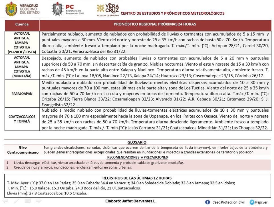 *Región Sur*: (Cuencas del Papaloapan, Coatzacoalcos y Tonalá, incluyendo Los Tuxtlas): Mayormente nublado, probabilidad de lloviznas, lluvias con tormentas (actividad eléctrica y ráfagas de viento). Acumulados esperados en 24 horas de 10 a 30 mm con máximos de 70 a 100 mm estas últimas en las partes altas de las cuencas y Los Tuxtlas. Viento del Norte de 30 a 40 km/h con rachas de 50 a 70 km/h en la costa. Ambiente relativamente caluroso a caluroso. Tmáx./Tmín. 30 a 33/21-24°C (Menores en la región de los Tuxtlas).