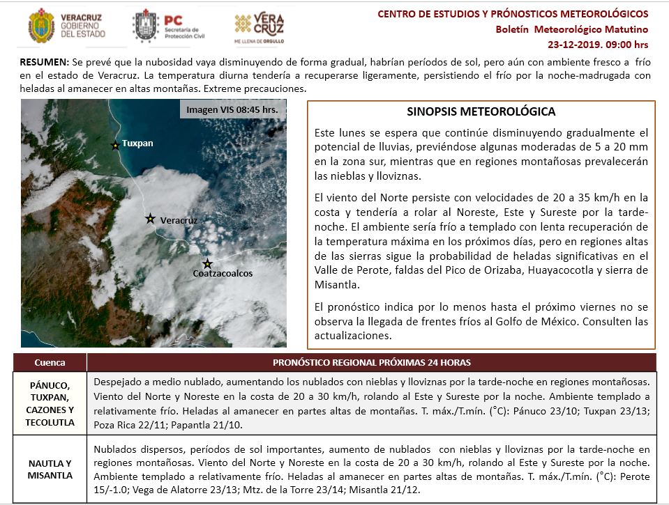 *Región Norte*: (Cuencas del Pánuco al Colipa): Despejado a medio nublado con aumento de nublados, nieblas y lloviznas por la tarde-noche en regiones montañosas. Acumulados estimados en 24 horas menores de 5 mm. Viento del Norte y Noreste en la costa de 20 a 30 km/h con tendencia a cambiar al Este y Sureste por la noche. Ambiente templado a frío durante el día, fresco a relativamente frío por la noche-madrugada. Probabilidad de heladas en zonas serranas. Tmáx./Tmín. 22-24°C/11-14°C (menores en la región de Huayacocotla).
