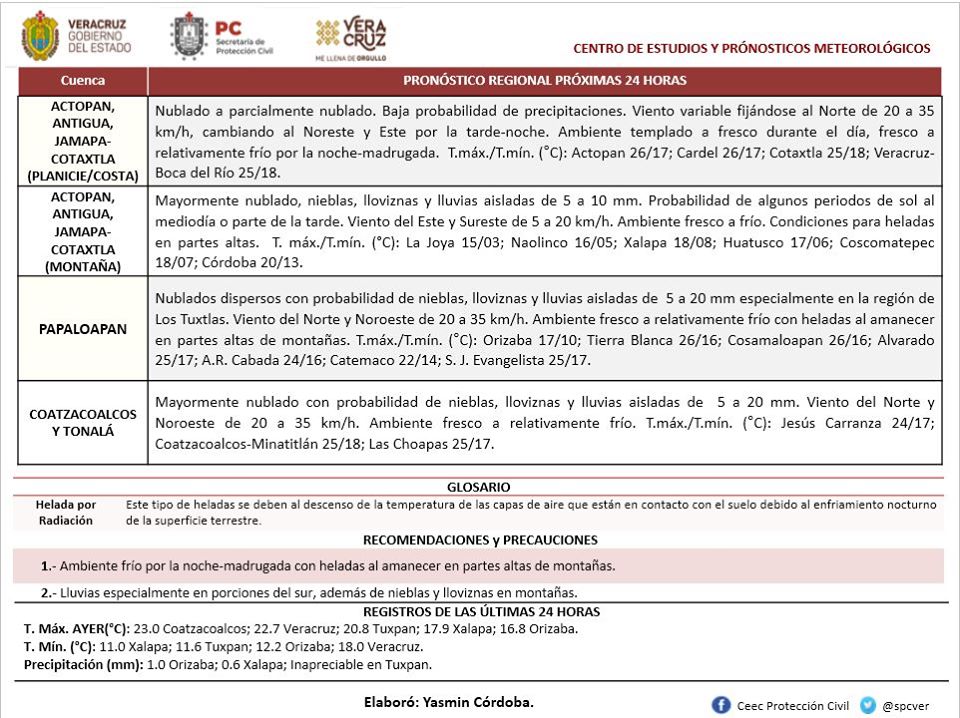 *Regiones montañosas del centro*: Mayormente nublado, nieblas, lloviznas y lluvias aisladas. Acumulados estimados en 24 horas de 5 a 10 mm. Probabilidad de algunos periodos de sol al mediodía o parte de la tarde. Viento del Este y Sureste de 5 a 20 km/h. Ambiente fresco a frío. Condiciones para heladas en partes altas. Tmáx/Tmín. 17-19/7-10°C (menores en el valle de Perote).