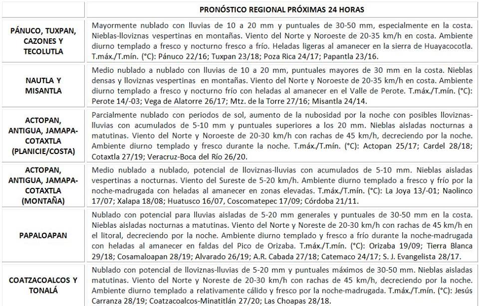 *Región Norte* (Cuencas del Pánuco al Colipa): Nublado a medio nublado, probabilidad de nieblas, lloviznas y lluvias aisladas generalmente por la tarde-noche. Acumulados esperados en 24 horas de 5 a 20 mm y puntuales mayores de 30 mm. Viento del Norte y Noroeste de 20 a 35 km/h con rachas de 40 km/h especialmente en la costa entre Pueblo Viejo y Tampico Alto. Ambiente diurno fresco a templado, fresco a frío por la noche-madrugada. TMáx/TMín 22-24/16-18 (menores en la región de Huayacocotla).