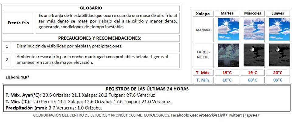 *Resumen*: La probabilidad de nieblas, lloviznas y lluvias aisladas ligeros y ocasionalmente moderadas puede persistir en las próximas 48 horas. En este periodo la temperatura máxima tendería a ser ligeramente más baja manteniéndose el ambiente fresco a frío por las noches-madrugadas con heladas en zonas altas. El viento dominante en la costa será del Norte con velocidades de 20 a 35 km/h y rachas de 45 km/h. Se recomienda seguir con las precauciones por ambiente frío a fresco y ante la probabilidad de heladas en zonas serranas y valle de Perote por las noches-madrugadas.