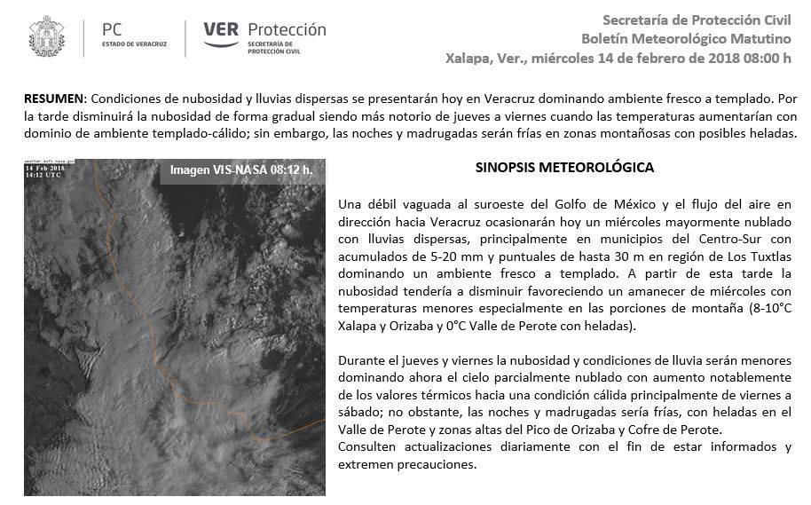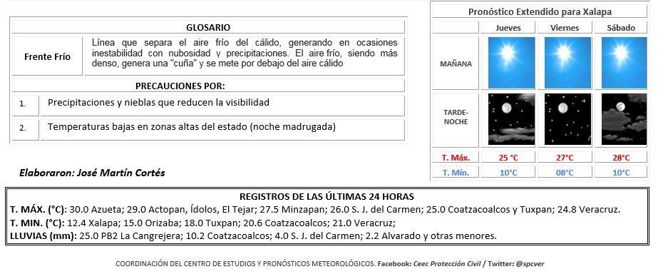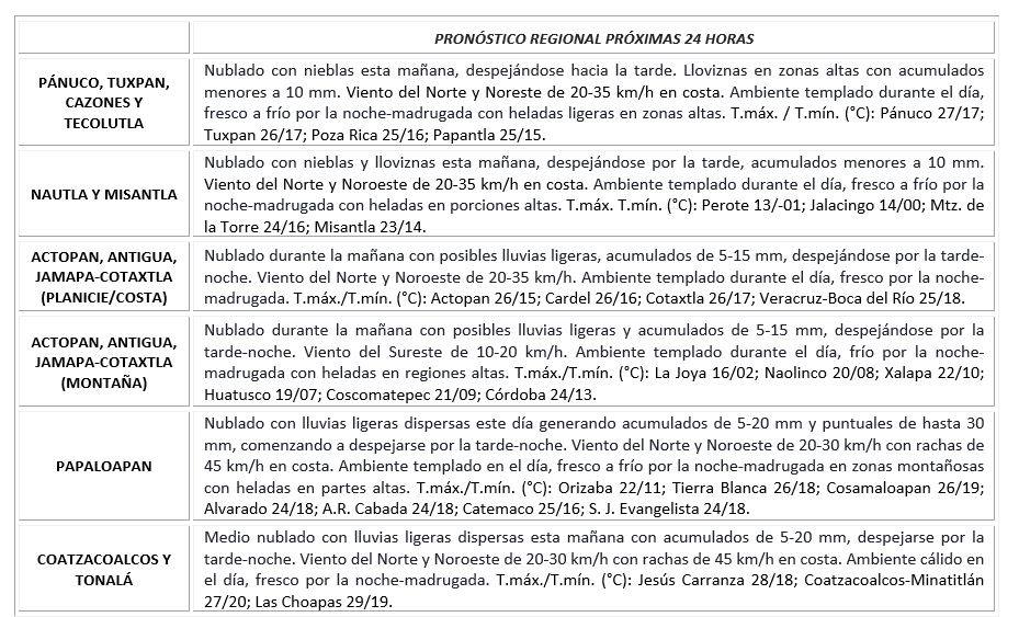 Mayormente nublado con lluvias ligeras y aisladas. Acumulados esperados en 24 horas de 5 a 10 mm. Nieblas en regiones montañosas. Viento del Norte y Noreste en la costa con velocidades de 20 a 30 km/h. Temperaturas máximas con poco cambio o ligeramente más altas. Ambiente fresco a frío por la noche-madrugada. TMáx/TMín 25-28/16-19°C (Menores en la región de Huayacocotla)