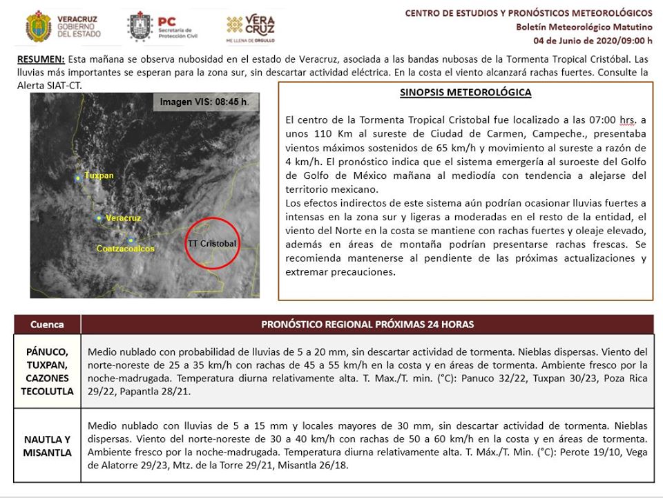*Resumen*: Durante este día se prevé persistan las condiciones para lluvias y tormentas (actividad eléctrica, ráfagas de viento y posible caída de granizo) con las más importantes en la zona sur y regiones montañosas. Ambiente relativamente caluroso al mediodía-tarde. El viento dominante en la costa será del Norte y Noroeste de 50 a 60 km/h con rachas de 70 a 80 km/h, también en la zona Xalapa-Misantla pueden presentarse rachas de 40 a 70 km/h. Se recomienda estar atentos, extremar las precauciones y acatar las indicaciones de las autoridades locales de protección civil. Es importante actualizarse diariamente de las condiciones meteorológicas a través de los informes meteorológicos. Consulte *Alerta SIAT-CT* por Tormenta Tropical *Cristobal*.