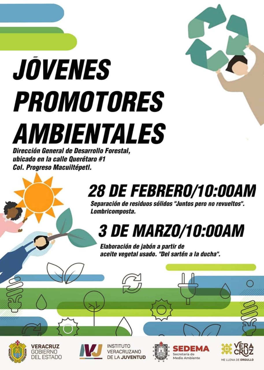 La secretaría de Medio Ambiente (SEDEMA), en coordinación con el Instituto Veracruzano de la Juventud (IVJ), convoca a personas de 15 a 29 años que tengan proyectos relacionados con la recuperación y preservación del medio ambiente, para recibir la capacitación previa al programa “Red de Jóvenes Promotores Ambientales”.