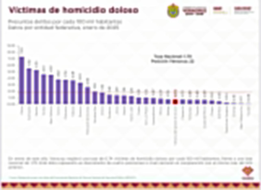 - De acuerdo con cifras del Secretariado Ejecutivo del Sistema Nacional de Seguridad Pública, Veracruz ocupa el lugar 22 en homicidios dolosos y el 25 en incidencia delictiva, gracias al trabajo coordinado en la Mesa de Construcción de Paz y Seguridad. En el mes de enero, la entidad registró una tasa de 0.74 víctimas de homicidio doloso por cada cien mil habitantes, frente a una tasa nacional de 1.79; este dato representa un decremento de cuatro posiciones en comparación con el mismo mes del año anterior. Mientras que, en incidencia delictiva, el pasado se ubicó en el lugar 25 con una tasa de 68.71 delitos por cada cien mil habitantes, mejorando una posición con respecto a diciembre de 2024. A través de sus redes sociales, la gobernadora Rocío Nahle García destacó que, el objetivo es que ningún ciudadano esté expuesto a la violencia; por ello, su administración trabaja en la reconstrucción del tejido social y en la coordinación con las dependencias para garantizar la paz el bienestar de la población.