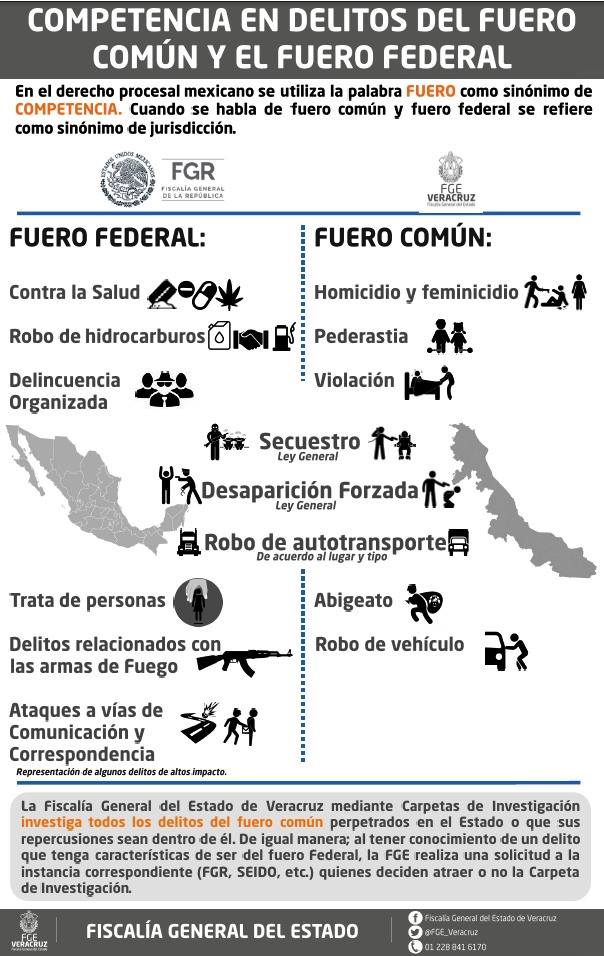 El Fiscal General realizó una diferenciación de competencias, detallando los delitos que corresponden al fuero común y los que competen a la Federación, como lo sustenta el Código Penal Federal y recalcó que en delitos cuya investigación no son competencia de la FGE, el órgano autónomo siempre ha colaborado y coadyuvado a solicitud de las autoridades.