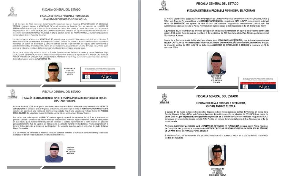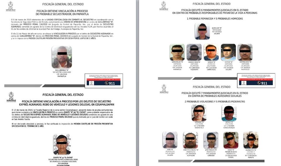 En el mismo periodo, fueron ejecutados mandamientos judiciales en contra de los probables violadores identificados como Cipriano “N”, en Ciudad Isla y Sergio “N”, en Cosoleacaque y por probable pederastia, Iván “N”, en Xalapa; Aniceto o Ángel “N”, en Acayucan; José Manuel “N”, en Córdoba; Hugo “N” en Cardel y Humberto “N”, en Perote.