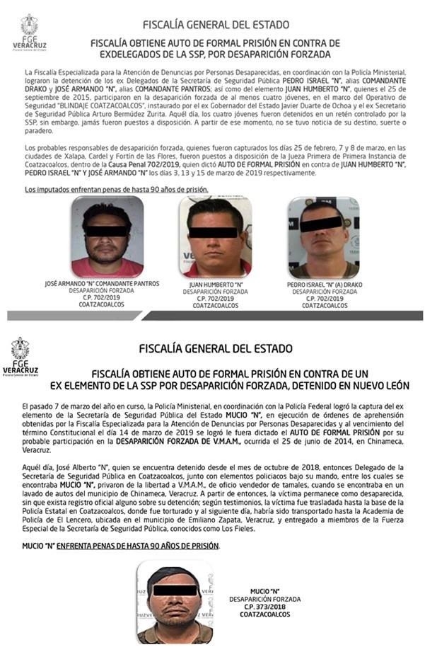A los ex delegados de la SSP, Pedro “N”, alias “El Comandante Drako” y José Armando “N”, alias Comandante Pantros”; así como el elemento identificado como Juan Humberto “N”, detenidos por la FGE el pasado 25 de febrero y 7 y 8 de marzo, en Xalapa, Cardel y Fortín, respectivamente, les fueron dictados autos de formal prisión por un Juez radicado en Coatzacoalcos, por el delito de desaparición forzada cometido el pasado mes de septiembre de 2015; en tanto que, otro ex elemento de la SSP identificado como Mucio “N” fue sujeto de un auto de formal prisión, por hechos ocurridos en el mes de octubre de 2018.