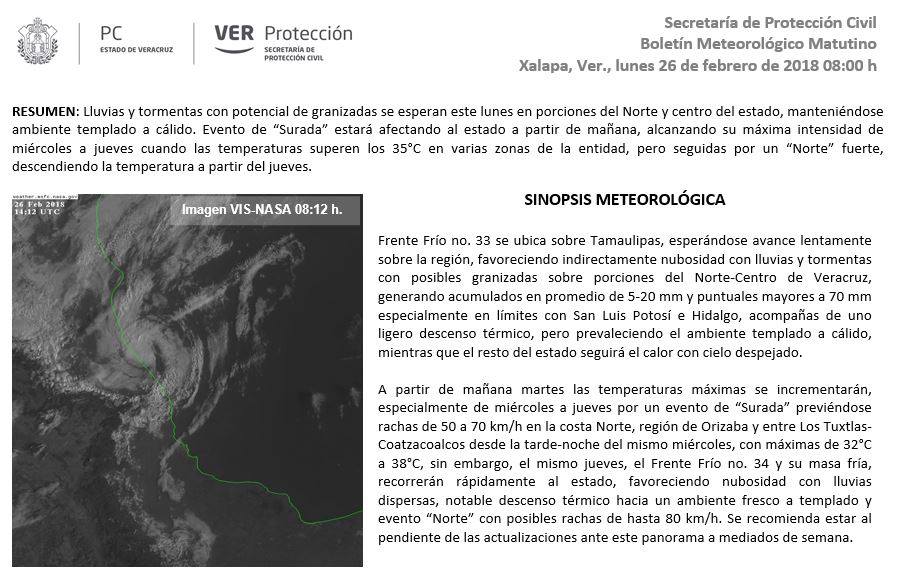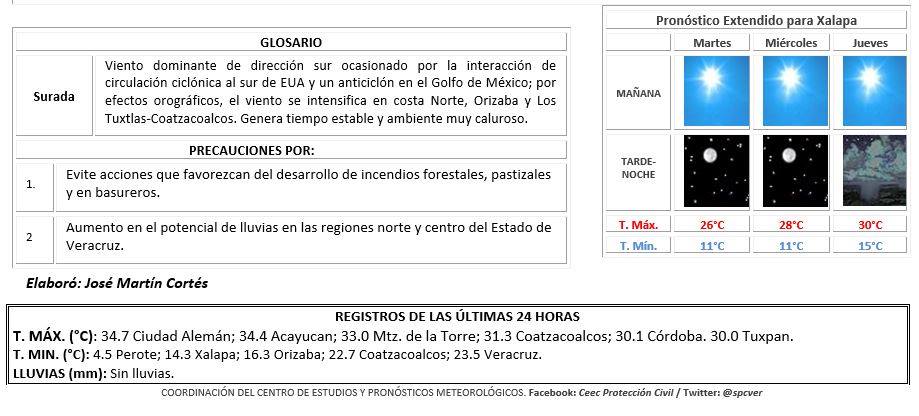 NOTA. Los modelos meteorológicos sugieren para los siguientes siete días en el estado de Veracruz una temperatura media por arriba de lo normal y lluvia por abajo de la climatología. Por otro lado, los modelos climáticos indican que MARZO presente una temperatura por arriba de la media y lluvia por abajo del promedio histórico.
