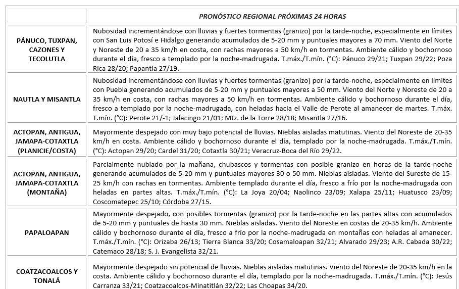 Disminución de nublados hacia el mediodía para aumentar nuevamente por la tarde-noche en regiones montañosas con probabilidad de algunas lluvias/tormentas (No se descarten granizadas). Acumulados esperados en 24 horas de 5 a 20 mm con máximos superiores de 50 a 70 mm. Nieblas por la madrugada en zonas de llanura y costa, y por la tarde-noche en regiones de montaña. Viento del Este y Noreste de 20 35 km/h en la costa con rachas en las zonas de tormentas. Ambiente cálido al mediodía y tarde, y fresco a relativamente frío por la noche-madrugada. TMáx/TMín 29-32/20-23°C (Menores en la región de Huayacocotla)