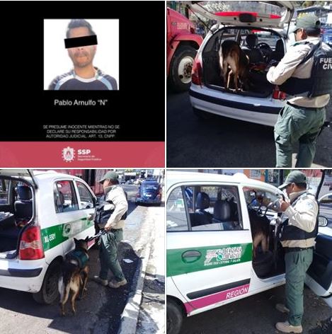 Efectivos realizaban una inspección de rutina para verificar que los conductores tuvieran documentación en regla, cuando un binomio canino detectó droga en el interior de un taxi; constatando que eran 42 dosis de cristal, 14 de cocaína, marihuana, un paquete de bolsas y una cuchara gramera. El conductor quedó a disposición de las autoridades.