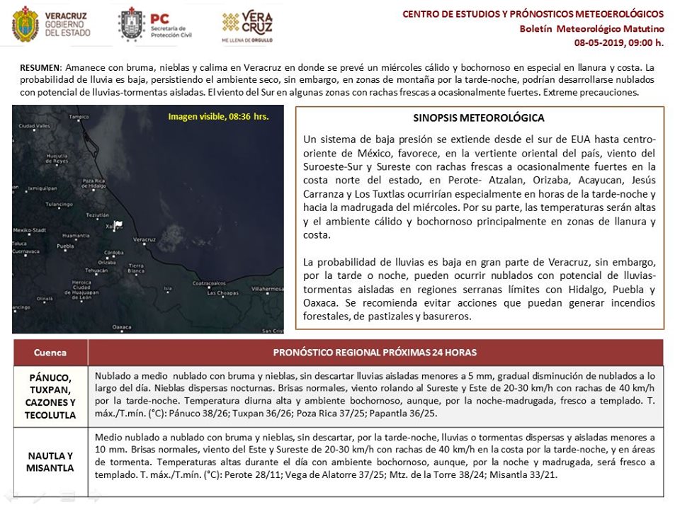 *Región Norte*: (Cuencas del Pánuco al Colipa): Nublado a medio nublado con lluvias escasas esta mañana en llanuras y costas, disminuyendo conforme avance la mañana. Probabilidad baja de lluvias y de tormentas en montañosas colindantes con Hidalgo y Puebla por la tarde-noche. Nieblas, bruma y calina durante el día. Viento del Sureste de 20 a 35 km/h con rachas de 45 a 60 km/h en la costa. Ambiente muy caluroso durante el día, templado por la noche-madrugada. Tmáx./Tmín. 34-39/23-27°C (mayores hacia la Huasteca y menores en la región de Huayacocotla).