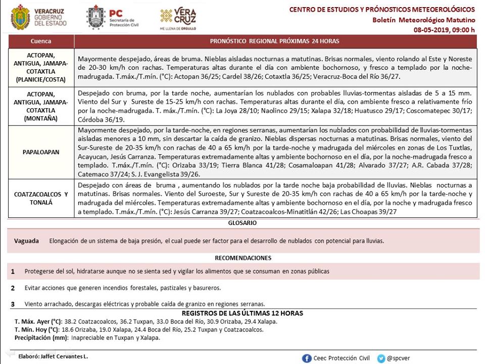 Los modelos meteorológicos sugieren para los siguientes siete días en el estado de Veracruz una temperatura media por arriba de lo normal y lluvia acumulada por abajo del promedio, excepto en regiones montañosas donde estaría dentro. Los modelos climáticos indican un MAYO 2019 con temperatura media por arriba de la medía; mientras que la lluvia acumulada estaría dentro-abajo de la climatología Los modelos climáticos indican un MAYO 2019 con temperatura media por arriba de la medía; mientras que la lluvia acumulada estaría dentro-abajo de la climatología.