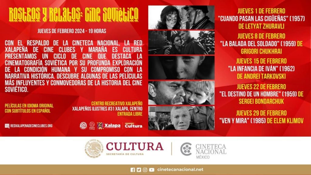 La proyección de estas emblemáticas historias del séptimo arte, que preparó la Dirección de Cultura en colaboración con la Cineteca Nacional, la Red Xalapeña de Cine Clubes y Maraña es Cultura A.C., permitirá al público sumergirse en la riqueza de la herencia cinematográfica de la Unión Soviética.