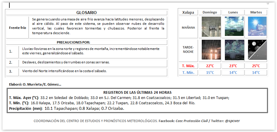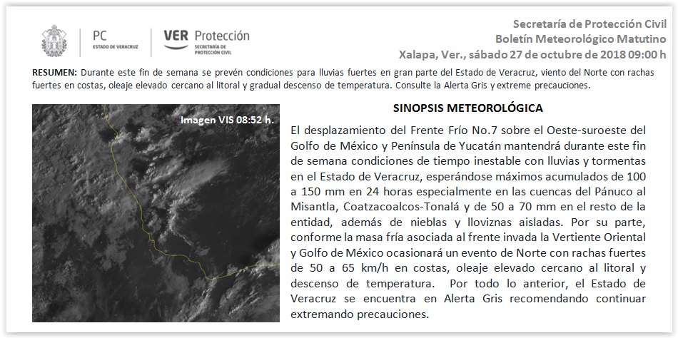 *Resumen*: Se prevé un fin de semana con probabilidad de tormentas y lluvias en gran parte del estado, concentrándose las más fuertes en la zona norte con valores máximos estimados en 24 horas de 70 a 150 mm, en las costas del centro y sur, y zona de Orizaba los máximos serían de 50 a 70 mm, sin descartar de manera más aislada mayores a este rango. La temperatura disminuirá ligeramente hoy. Viento dominante del Norte y Noreste de 30 a 40 km/h con rachas eventuales entre 50 a 60 km/h. Se recomienda seguir extremando las precauciones por las crecidas de los ríos del sur, asimismo mantenerse atentos al comportamiento de los ríos y arroyos de respuesta rápida, así como ante una mayor probabilidad de deslaves, derrumbes y deslizamientos, atender las indicaciones de las autoridades locales de Protección Civil. Consulte la *Alerta Gris*.