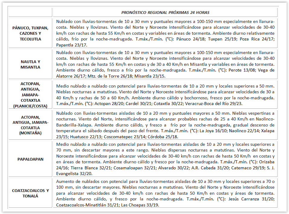 *Región Norte* (Cuencas del Pánuco al Colipa): Nublado, probabilidad de tormentas y lluvias. Acumulados estimados en 24 horas de 10 a 30 mm con máximos de 70 a 150 mm. Viento del Noreste y Noroeste de 20 a 30 km/h con rachas de 40 a 50 km/h en la costa y rachas mayores en zonas de tormenta. Disminuyendo la temperatura. TMáx/TMín 24-26/19-21 (menores en la región de Huayacocotla).