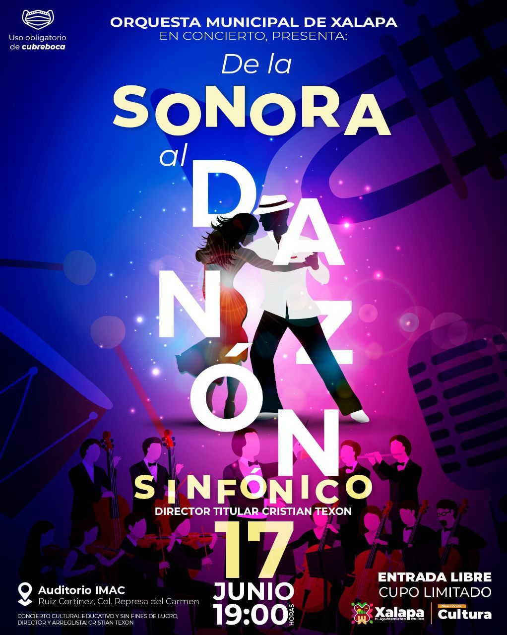 El Ayuntamiento, a través de la Dirección de Cultura, invita al concierto de la Sonora al Danzón Sinfónico, que bajo la dirección de Cristian Texon presentará la Orquesta Municipal de Xalapa este viernes 17 de junio, a las 19:00 horas, en el auditorio de la Iniciativa Municipal de Arte y Cultura (IMAC).