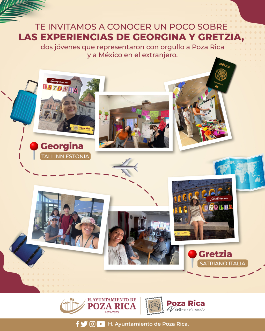 El gobierno municipal, en colaboración con la asociación civil “Vive México”, otorgó este año 10 becas para participar en voluntariados internacionales en los ámbitos sociales, culturales, académicos y medioambientales. Georgina realizó su voluntariado multicultural en la ciudad de Tallinn, Estonia, donde tuvo la oportunidad de convivir con personas de diferentes nacionalidades, permitiéndole aprender nuevos idiomas, culturas y conocer diversas formas de vida. Con ello mejoró sus habilidades comunicativas y fortaleció su capacidad de adaptación al entorno internacional. Gretzia, por su parte, colaboró en su voluntariado social, apoyando en un comedor comunitario en Satriano, Italia, asistiendo a personas en situación vulnerable y en condición de calle, poniendo en práctica su empatía y su sentido humanista. Esta experiencia no solo le permitió contribuir a una causa social importante, sino también adentrarse en la gastronomía local y aprender de ella.