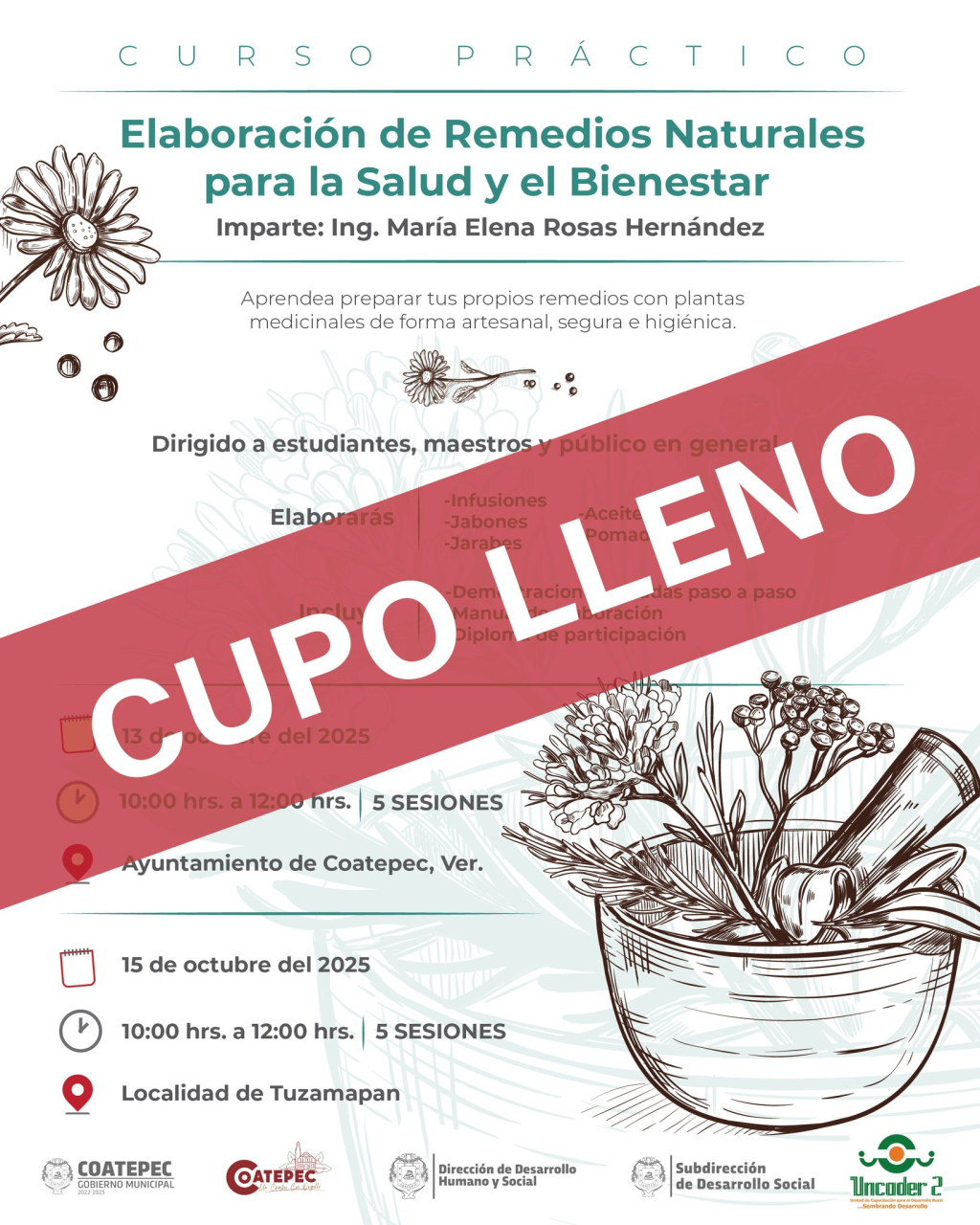 El H. Ayuntamiento de Coatepec, informa que el “Curso de Elaboración de Remedios Herbolarios” que será impartido a partir del 13 de octubre en el Palacio Municipal de Coatepec y en la localidad de Tuzamapan el 15 de octubre, ha alcanzado su cupo completo.