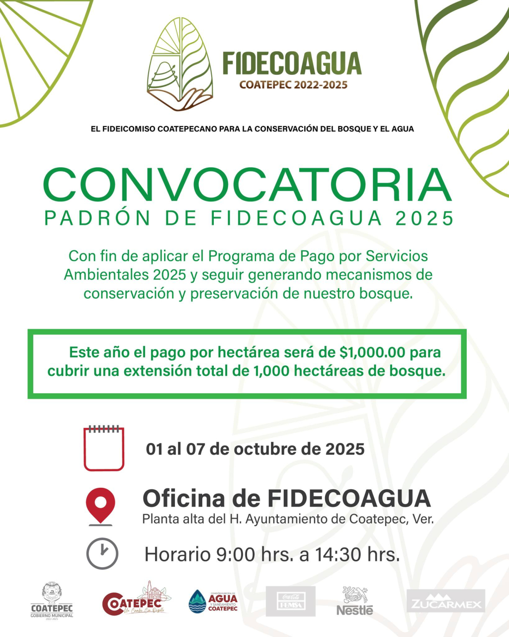 El H. Ayuntamiento de Coatepec, por medio del Fideicomiso Coatepecano para la Conservación del Bosque y el Agua (FIDECOAGUA), emite la Convocatoria para el Padrón FIDECOAGUA 2025, con el fin de aplicar el Programa de Pago por Servicios Ambientales y seguir impulsando acciones de conservación y preservación de nuestros bosques.