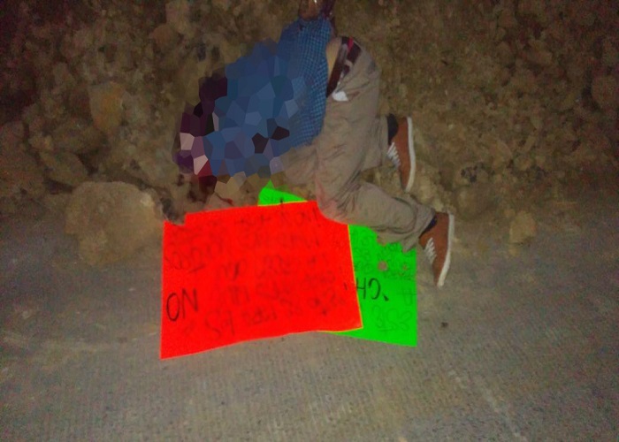Esta mañana alrededor de las 06:30 horas fue encontrado una persona del sexo masculino sin vida junto con dos cartulinas con mensajes intimidatorios en la colonia Higueras.