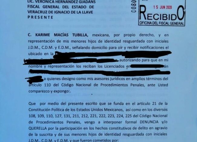 Los abogados del despacho de Marco del Toro Carazo, presentaron una denuncia de Karime Macías Tubilla, exesposa del exgobernador Javier Duarte de Ochoa, contra el exgobernador Miguel Ángel Yunes Linares y el exfiscal del Estado, Jorge Wincker Ortíz por abuso de autoridad, incumplimiento de un deber legal y tráfico de influencias.