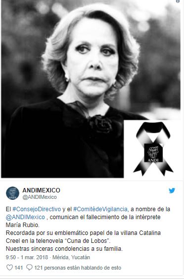 El servicio noticioso de Televisa, Foro TV, confirmó el deceso de la primera actriz, del que no se han dado más detalles.