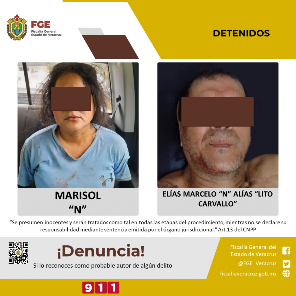 La Fiscalía General del Estado informa, que elementos de la Policía Ministerial, en la comunidad El Tibernal, del municipio de Santiago Tuxtla, cumplimentaron orden de aprehensión en contra de Elías Marcelo “N”, alias “Lito Carvallo” por el presunto delito de abigeato quien se encontraba en compañía de su esposa Marisol “N”, la cual también fue detenida ya que al momento de proceder al cumplimiento del mandato judicial, ambos agredieron a los elementos policiacos con arma de fuego.
