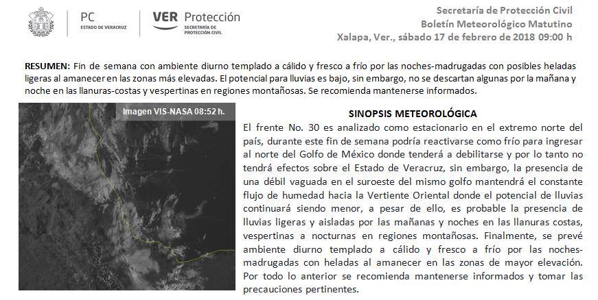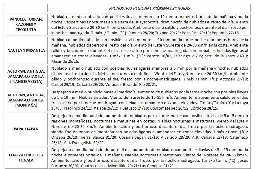Mayormente nublado a parcialmente nublado con lluvias aisladas. Acumulados esperados en 24 horas de 5 a 20 mm. Nieblas eventuales en Los Tuxtlas y nocturnas a matutina en zonas bajas. Viento del Norte y Noreste con velocidades de 20 a 35 km/h. Temperaturas máximas con poco cambio. TMáx/TMín 27-30/20-23°C (Menores en la región de los Tuxtlas).