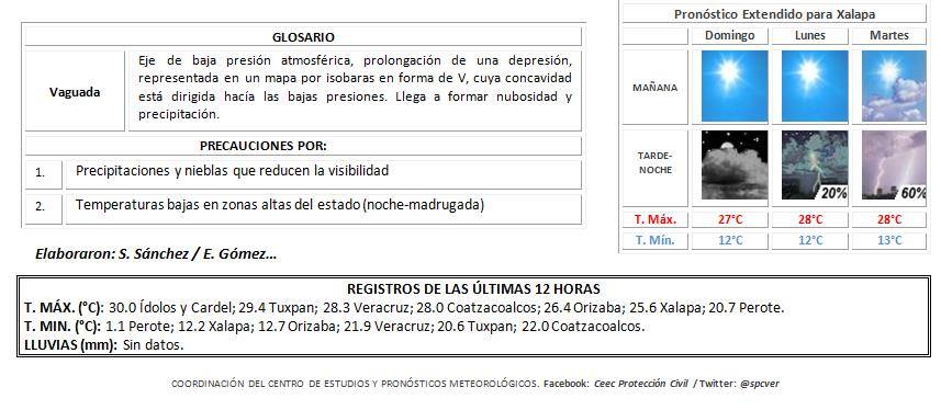 Nublado a medio nublado con probabilidad de algunas lluvias. Acumulados esperados en 24 horas menores de 10 mm. Nieblas vespertinas a nocturnas en regiones montañosas y matutinas en zonas de llanura y costa. Viento variable fijándose al Este y Sureste de 20 a 35 km/h. Temperaturas máximas con poco cambio. Ambiente fresco a frío por la noche-madrugada. TMáx/TMín 28-31/19-22°C (Menores en la región de Huayacocotla)