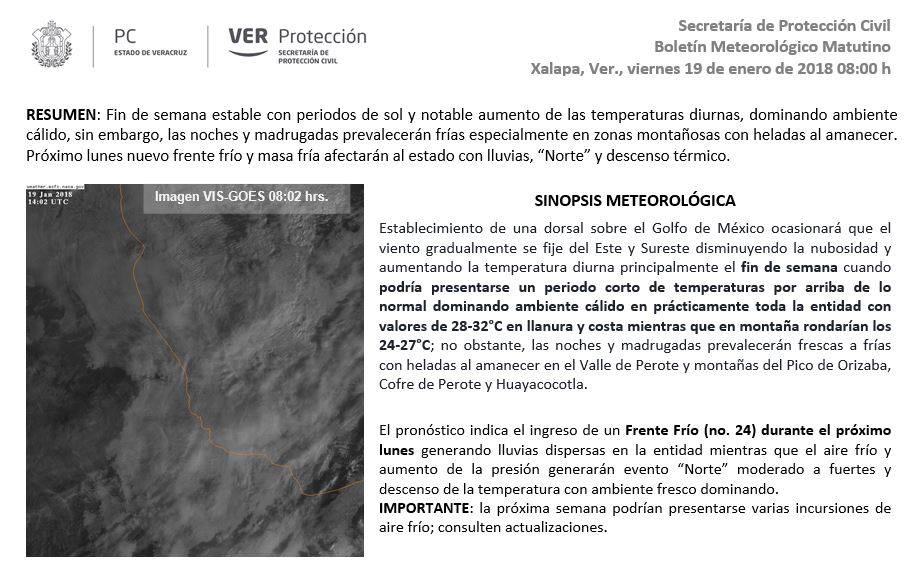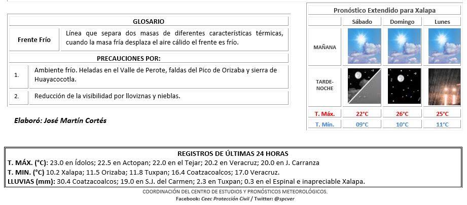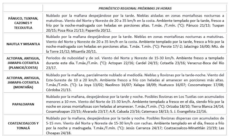 Mayormente nublado con lluvias aisladas. Acumulados esperados en 24 horas de 5 a 20 mm con máximos de 30 mm. Nieblas en la región de los Tuxtlas. Viento del Norte de 20 a 30 km/h rolando al Noreste por la tarde con igual velocidad . Temperaturas máximas ligeramente más altas persistiendo el ambiente fresco por la noche-madrugada. TMáx/TMín 21-24/14-17°C (Menores en la región de los Tuxtlas).