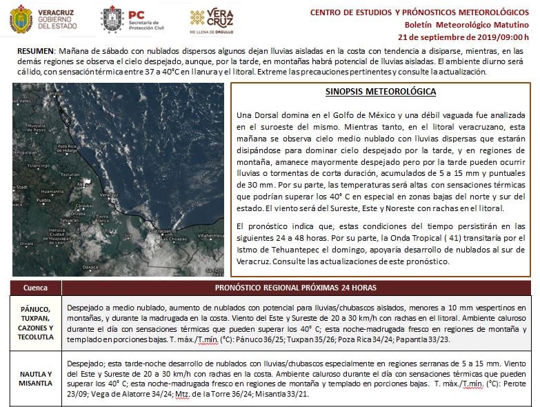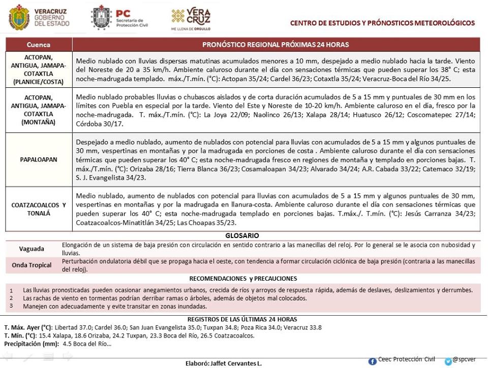 *Regiones montañosas del centro*: Medio nublado por la mañana, aumentando los nublados y la probabilidad de lluvias por la tarde-noche acompañadas de tormentas (actividad eléctrica, ráfagas de viento y probable caída de granizo). Acumulados esperados en 24 horas de 5 a 10 mm con máximas de 20 a 30 mm de manera más dispersa. Viento dominante del Este y Sureste de 10 a 25 km/h con rachas en zonas de tormenta. Tmáx/Tmín. 25-28/14-17°C (menores en el valle de Perote).
