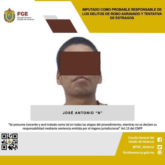 La Fiscalía General del Estado informa que, la Fiscalía Regional Tuxpan realizó imputación en contra de José Antonio “N” como probable responsable de los delitos de robo agravado y tentativa de estragos, cometidos en agravio de la Cadena Comercial Oxxo, S.A DE C.V.