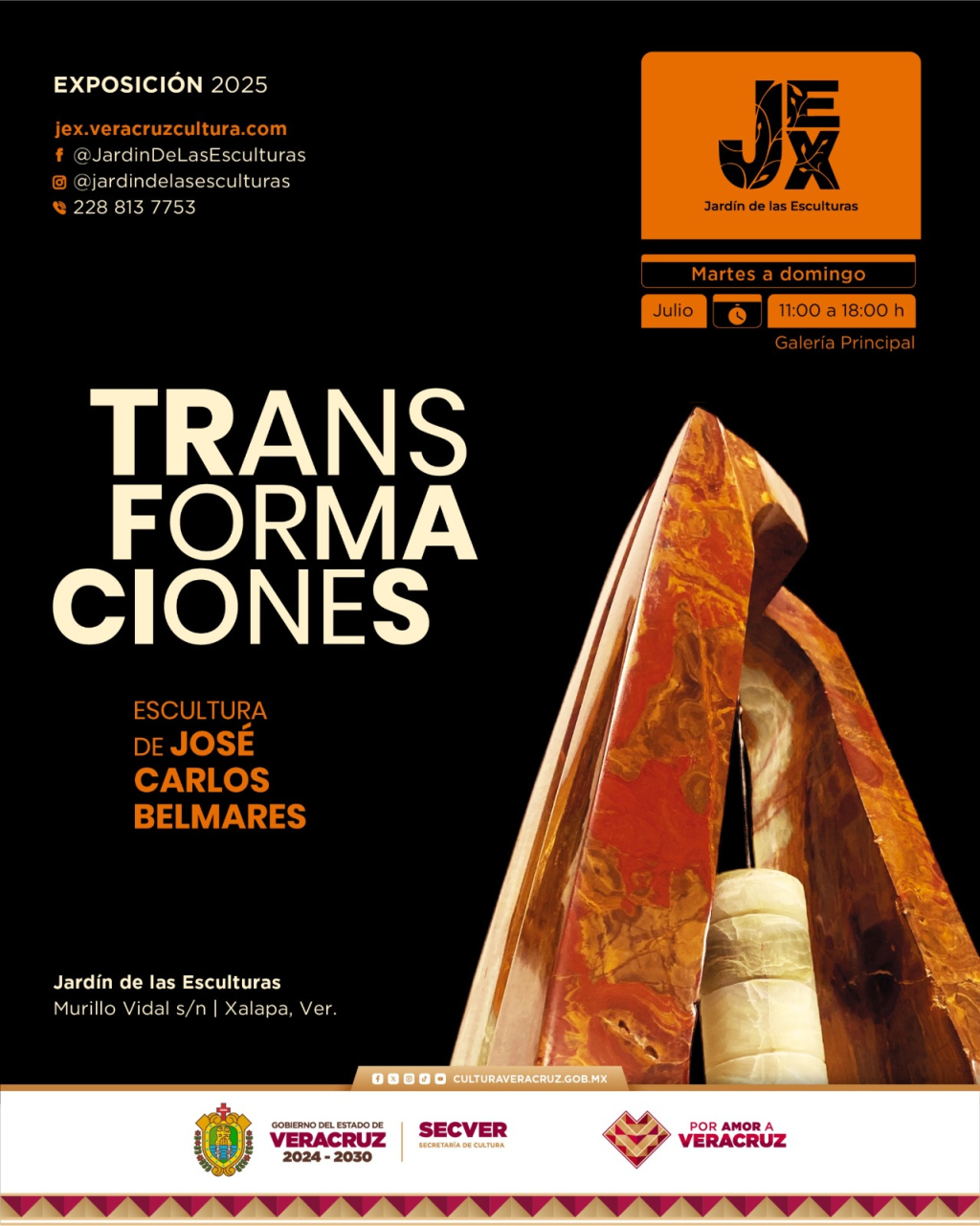 La Secretaría de Cultura de Veracruz (SECVER) invita al público a asistir a la inauguración doble de las exposiciones: Transformaciones, escultura de José Carlos Belmares y Besos suaves, vasijas y muchas flores de Marcelino Barsi, este día a las 19:00 horas, en el Jardín de las Esculturas (JEX). La entrada es gratuita.
