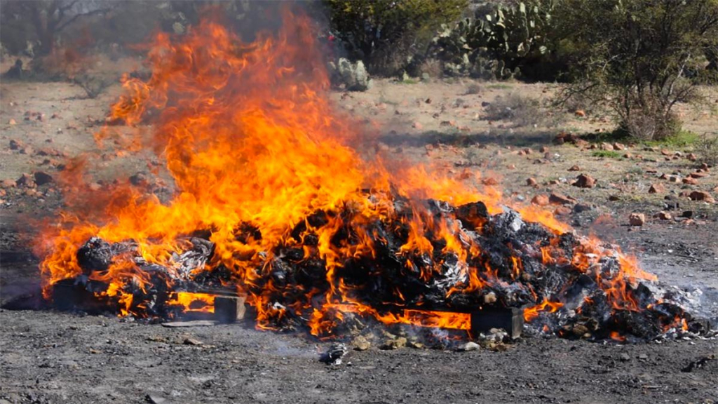 En dicha incineración ordinaria fueron destruidas 408 kilos 583 gramos y 592 miligramos de marihuana, 17 gramos 493 miligramos de clorhidrato de cocaína, tres gramos 200 miligramos de cocaína, 200 miligramos de diacetilmorfina, 350 gramos 200 miligramos de metanfetamina, tres gramos 900 miligramos de amapola, 21 gramos 900 miligramos de Delta 8 THC y Delta 9 THC, 52 plantas de marihuana y mil 401 objetos del delito.