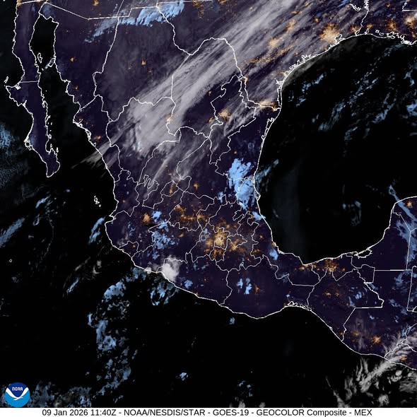 *Regiones Montañosas del Centro:* Despejado a medio nublado gran parte del día. A partir de mañana, la probabilidad de lluvias aumenta. Nieblas o neblinas eventuales nocturnas a matutinas. Viento del Suroeste, Sur y Sureste de 20 a 30 km/h, con rachas eventuales de 45 km/h en la región de Orizaba y el valle de Perote, cambiando al Norte mañana con rachas de 45 a 60 km/h entre Xalapa-Noalinco-Misantla y el valle de Perote. Ambiente relativamente caluroso al mediodía y frío por la noche a madrugada, con heladas fuertes en zonas altas.