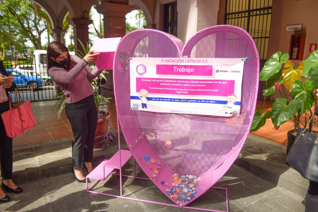 La directora del Conmas, Mónica Gasperín Sánchez, explicó que este contenedor en forma de corazón servirá para recibir tapas de plástico tipo PET, de cualquier tamaño, las cuales la fundación puede vender para obtener recursos y pagar tratamientos para quienes padecen esta enfermedad: “Un contenedor lleno representa una quimioterapia”, agregó.
