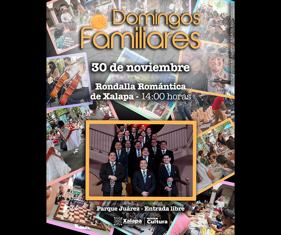 El domingo, a las 10:00 horas, en el CRX, iniciará el taller de Encuadernación Especializada, impartido por Carlos H. Navarro. A las 12:00 horas, en el Parque Juárez, se desarrollará el tradicional programa “Domingos Familiares”, seguido de la presentación de la Rondalla Romántica de Xalapa.