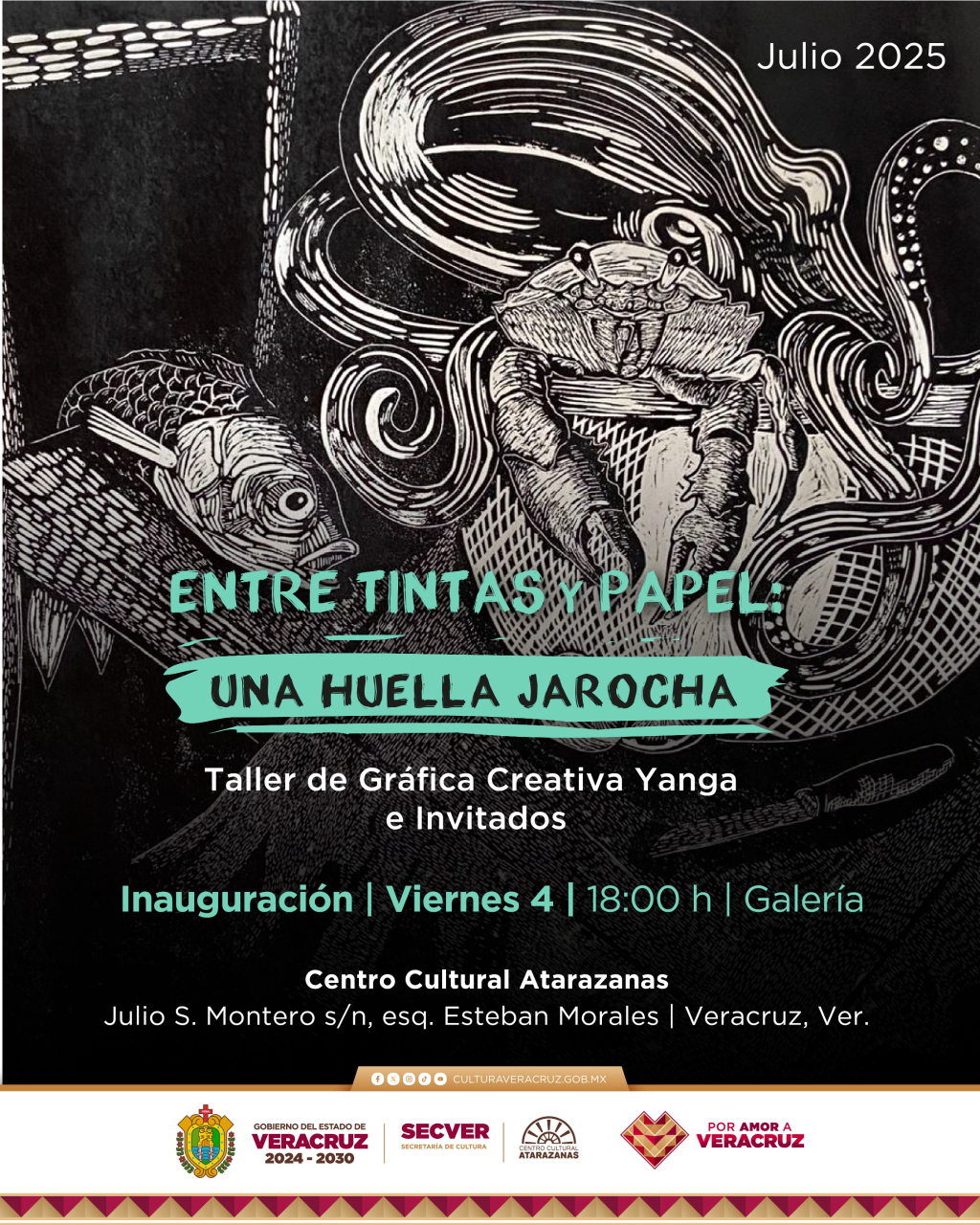 La Secretaría de Cultura de Veracruz (SECVER) invita a la inauguración de la exposición colectiva Entre Tintas y Papel: Una Huella Jarocha, que se llevará a cabo este viernes, a las 18:00 horas, en la Galería del Centro Cultural Atarazanas, con entrada libre.