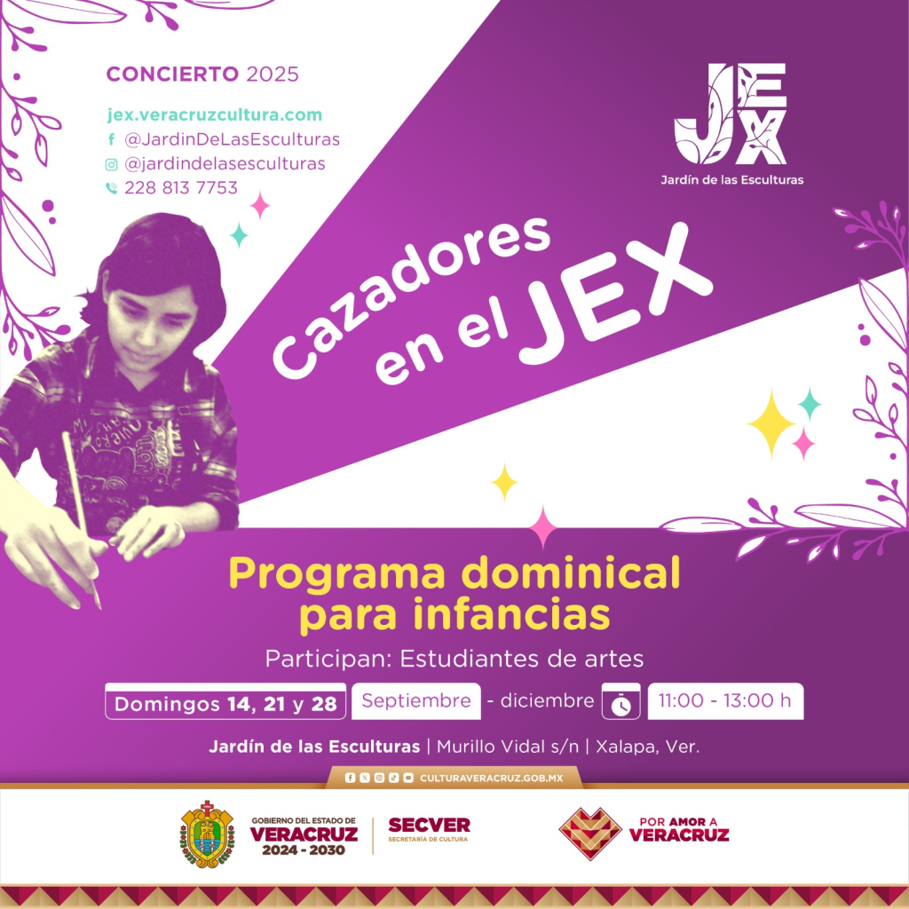 Xalapa, Ver., viernes 12 de septiembre de 2025.- La Secretaría de Cultura de Veracruz (SECVER) invita a las niñas y niños a participar en la primera temporada del programa dominical Cazadores del JEX, propuesta de actividades diseñadas para la sensibilización artística. Se llevará a cabo los domingos 14, 21 y 28 de septiembre, de 11:00 a 13:00 horas, en el Jardín de las Esculturas. La entrada es gratuita.