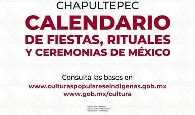 “Calendario de fiestas, rituales y ceremonias de México” es el título de la más reciente convocatoria que anuncia la Secretaría de Cultura del Gobierno de México, a través de la Dirección General de Culturas Populares, Indígenas y Urbanas (DGCPIU), como parte de las acciones del proyecto prioritario Chapultepec, Naturaleza y Cultura. En ella, se hace un llamado a las y los jóvenes mexicanos de todo el país para registrar las expresiones culturales del patrimonio cultural inmaterial de sus comunidades, mediante fotografías y videos.