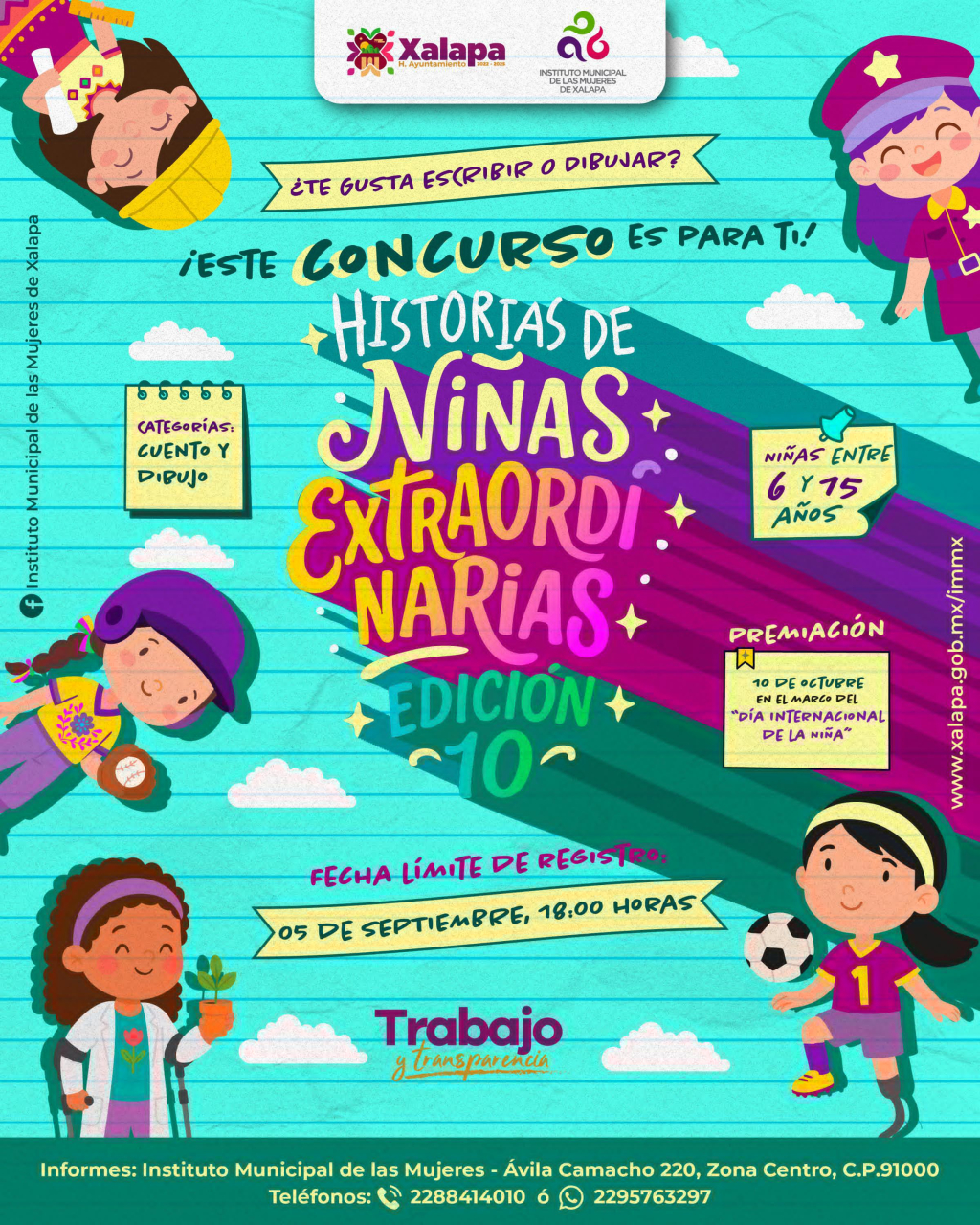 Xalapa, Ver.- Con el objetivo de fomentar la creatividad, la participación y la inclusión social de niñas y adolescentes, el Ayuntamiento, a través del Instituto Municipal de las Mujeres de Xalapa (IMMX), convoca a la décima edición del concurso de cuento y dibujo “Historias de Niñas Extraordinarias”.