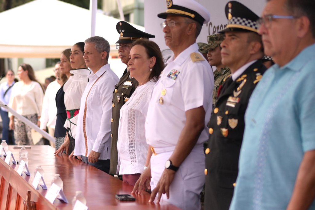 En el presídium estuvieron el jefe mayor de la 1ª Región Naval, Jesús Arellano Rodarte; el coordinador estatal de la Guardia Nacional, Iván Navarrete Torres y la fiscal general del Estado, Verónica Hernández Giadáns.