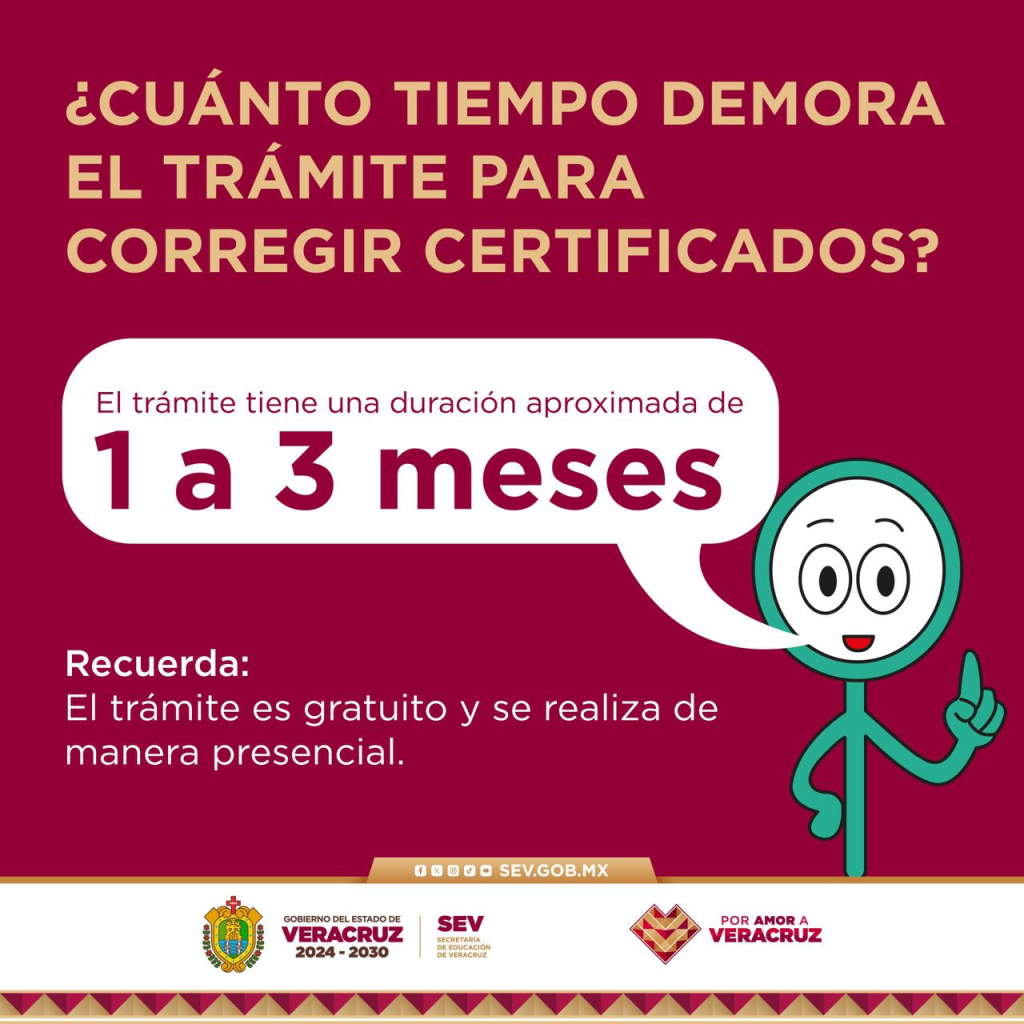 La Dirección Jurídica de la SEV informa que el trámite de dictamen para corrección de certificados de estudios tiene una duración aproximada de 1 a 3 meses, según el caso y la documentación presentada.