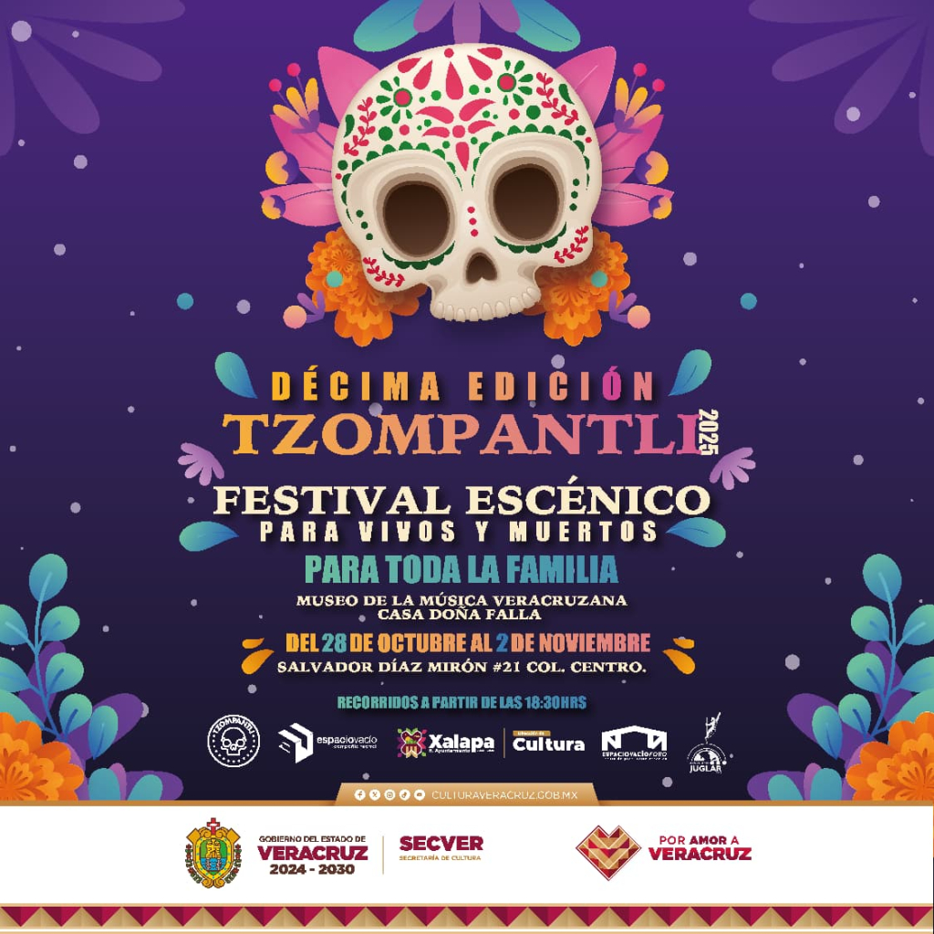 Xalapa, Ver., miércoles 29 de octubre de 2025.- La Secretaría de Cultura de Veracruz (SECVER) invita a la celebración del décimo aniversario del Festival Escénico Tzompantli, desde hoy y hasta el domingo 02 de noviembre a partir de las 18:30 horas.