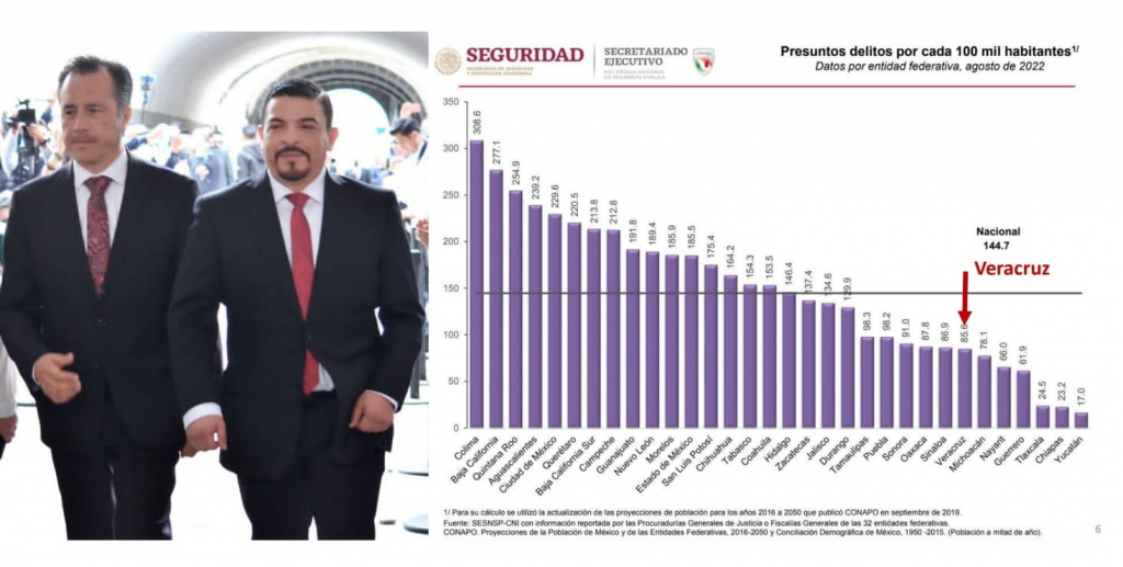 Las cifras nacionales en materia índices delictivos no mienten. Veracruz está entre las 10 entidades más seguras del país. En delitos generales somos el séptimo lugar más seguro del país y en homicidio estamos en el octavo renglón (con algunas Entidades empatadas) de las más seguras.